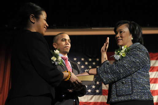 Toni Nathaniel Harp (r), was sworn in as New Haven’s first female mayor as her daughter Djana (l), holds onto the bible while her son Matthew...