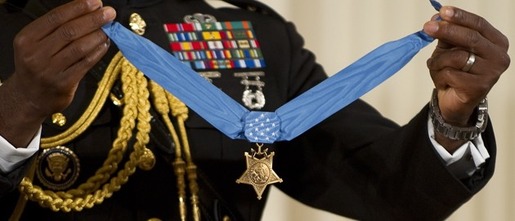 A military aide holds up the Medal of Honor as the citation is read before U.S. President Barack Obama awarded US Marine Corps SGT Dakota Meyer...