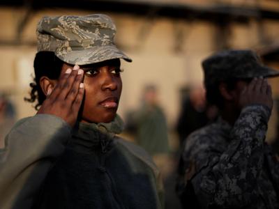 African American women soldiers salute while the national anthem is played at the U.S. Camp Eggers in Kabul, Afghanistan./AP Photo/Anja Niedringhaus Black women are enlisting in...