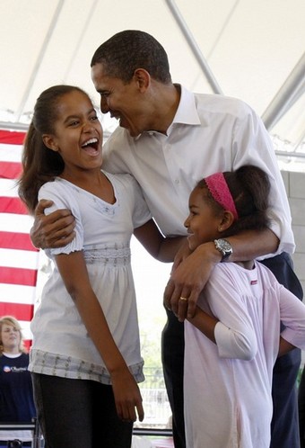 U.S.President Barack Obama shares a light moment with his daughters. President Barack Obama has pitched in to help small businesses get into the holiday shopping season....