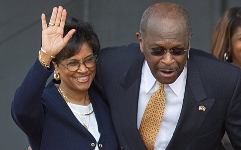 Then Republican presidential candidate businessman Herman Cain waves to the crowd before a Republican presidential debate Tuesday, Oct. 18, 2011, in Las Vegas. PHOTO/Isaac Brekken/AP Herman...