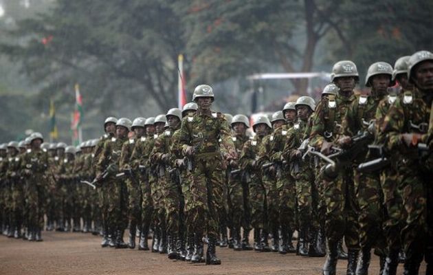 Members of Kenya’s army march dais during a recent ceremony in Nairobi. A push by Kenyan ground forces toward a strategic Somali town has been slowed...