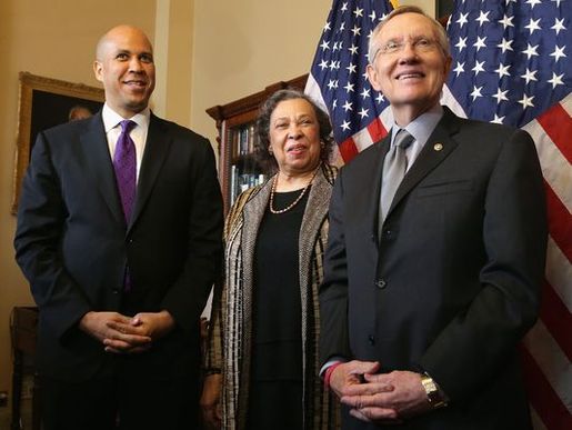 Newly sworn in Sen. Cory Booker (l), his mother Carolyn with Senate Majority Leader Harry Reid New Jersey’s Cory Booker has been sworn in as a...