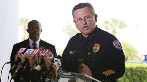 Former Sanford Police Chief Bill Lee speaks to the the media during a news conference as city manager Norton Bonaparte Jr. listens at left. PHOTO/Julie Fletcher/AP...