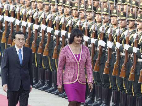 Jamaican Prime Minister Portia Simpson-Miller (r), accompanied by Chinese Premier Li Keqiang, inspects a guard of honor at the Great Hall of the People in Beijing,...