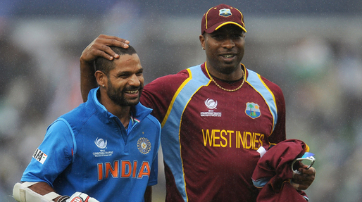 Shikhar Dhawan of India (l) with Kieron Pollard of the West Indies during the Tri-Nation series ODI match between India and the West Indies, June 30...