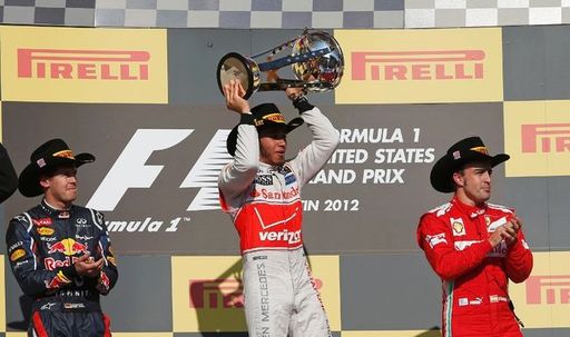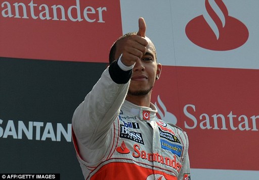 A victorius Lewis Hamilton holds aloft his trophy next to second placed Red Bull Formula One driver Sebastian Vettel (l) and third placed Ferrari Formula One...