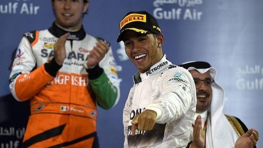 A jubilant Lewis Hamilton celebrates his winning the Bahrain Formula One Grand Prix., Sunday April 6, 2014. PHOTO/AFP Lewis Hamilton won a thrilling Bahrain Formula One...
