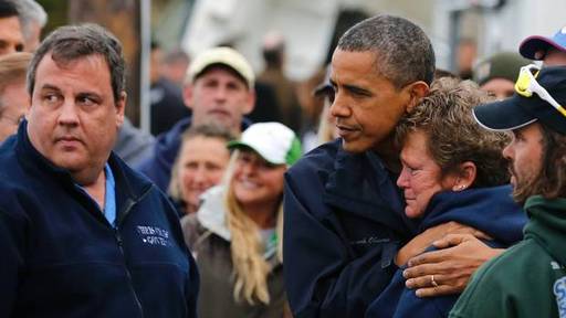 U.S. President Barack Obama (r) accompanied by N.J Gov. Chris Christie (l) hugs storm victim Donna Vanzant as he tours damage done by Hurricane Sandy in...