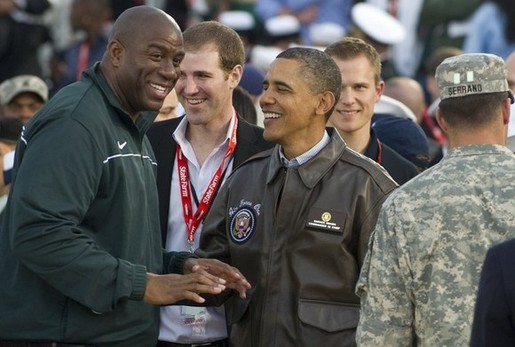 U.S. President Barack Obama (r) chats with former Los Angeles Lakers great Magic Johnson (l) during the Carrier Classic college basketball game between the University of...