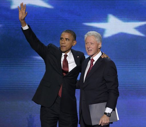 U.S. President Barack Obama (l) joins former President Bill Clinton, after nominating speech. PHOTO/J. Scott Applewhite/AP President Barack Obama goes before the Democratic National Convention and...