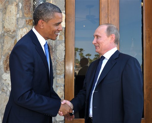 U.S. President Barack Obama, (l), greets Russia’s President Vladimir Putin at the G-20 Summit in Los Cabos, Mexico, Monday, June 18, 2012. PHOTO/Alexei Nikolsky/RIA-Novosti,Presidential Press Service...