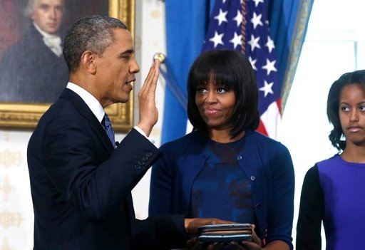 U.S. President Barack Obama is sworn in by Chief Justice John Roberts, not pictured, in the Blue Room of the White House during the 57th Presidential...