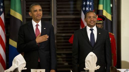 U.S. President Barack Obama and Tanzanian President Jakaya Kikwete stand for the national anthem at the State House in Dar es Salaam, Tanzania, July 1, 2013....